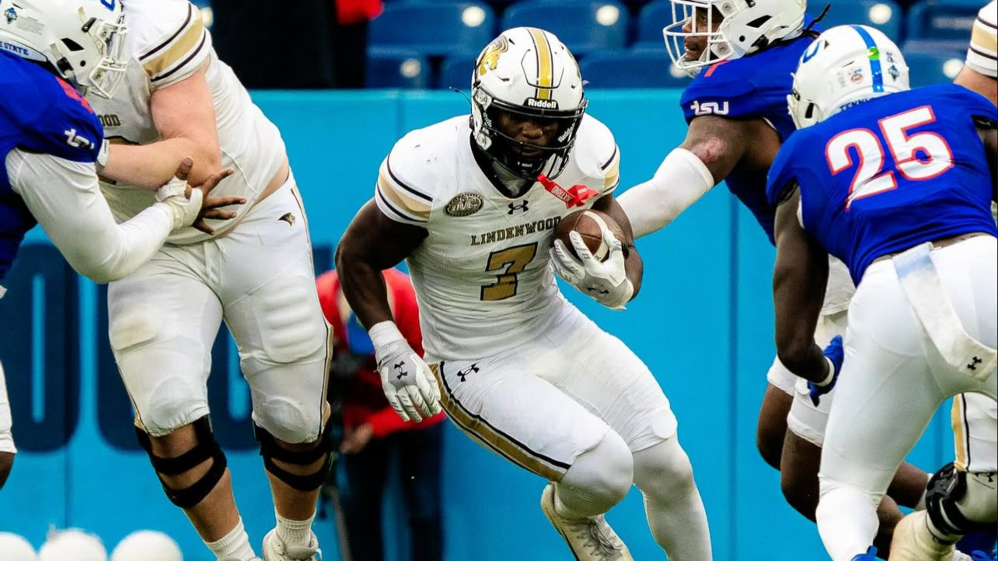 In a game defined by high-effort plays, Lindenwood scored five rushing touchdowns, forced six consecutive three-and-outs, and earned a 35-13 victory at Tennessee State in an OVC-Big South clash Saturday at Nissan Stadium.