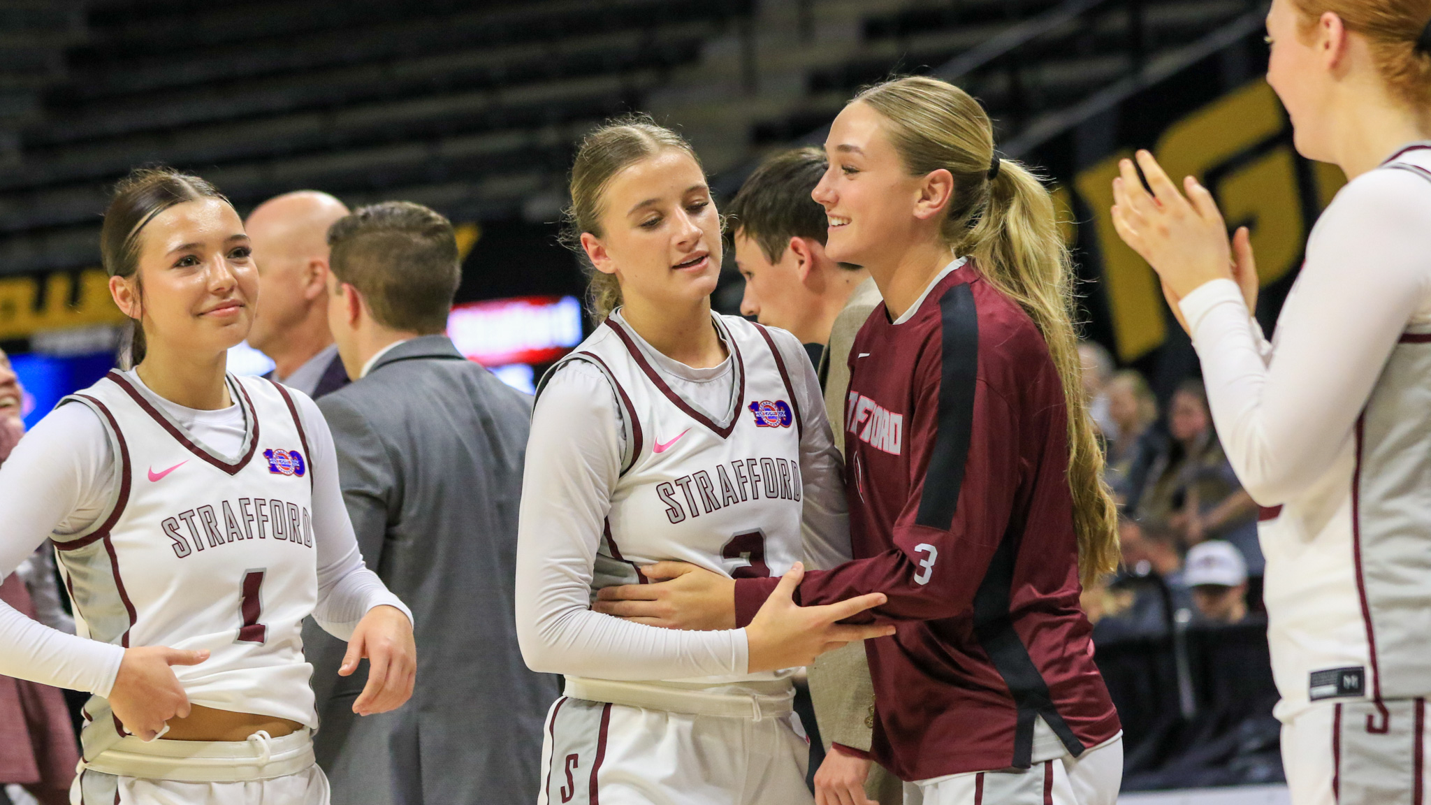 Sister Act: Teammates form a receiving line to hug senior captain Elsie Larsen (red) during the Class 4 championship game against Doniphan during the 2026 Show-Me Showdown on Thursday, March 19, 2026 at Mizzou Arena in Columbia, MO. | Photo by Ben Vessa